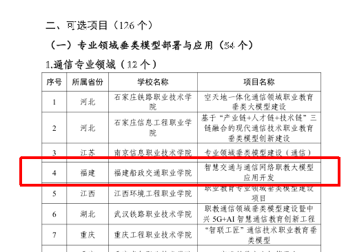 近日,教育部職業教育發展中心公布了“職業教育專業領域垂類模型建設項目(第一批)”入選名單,由我院信息與智慧交通學院團隊申報的“智慧交通與通信網絡職教大模型應用開發”項目成功入選,成為通信專業領域重點建設項目之一。